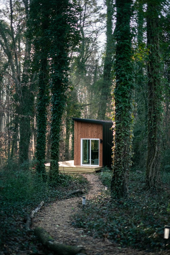 Skandinaviskt minihus i skogen med natur