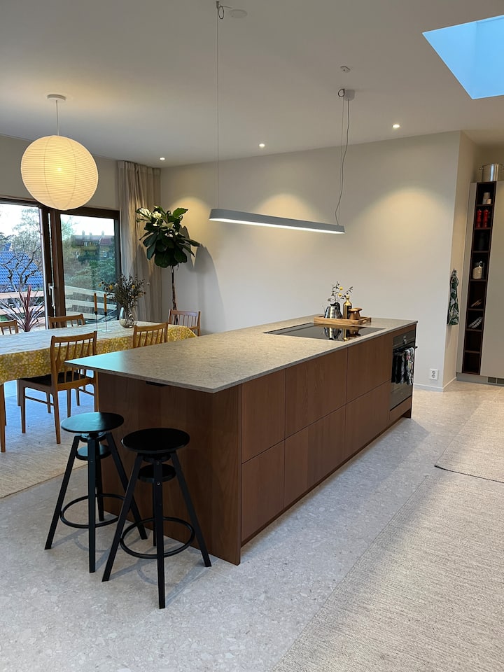 Stort hus med trädgård och takterrass