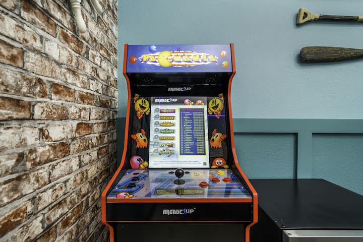 Köket är fullt utrustat, inklusive en Keurig kaffebryggare och sida vid sida kylskåp med en ismaskin och vattendispenser. Köket har barstolar för två och öppnar upp till det öppna vardagsrummet och matplatsen. Hela familjen kan njuta av middag vid det stora, runda matbordet för åtta. Luta dig tillbaka och njut av din favoritshow eller film på den stora sektionssoffan och den stora väggmonterade smart-TV:n. Gäster kommer också att kunna läsa eller planera semestrar i den lilla arbetsstationen i sitt vardagsrum. Det finns en toalett på nedervåningen för gäster.