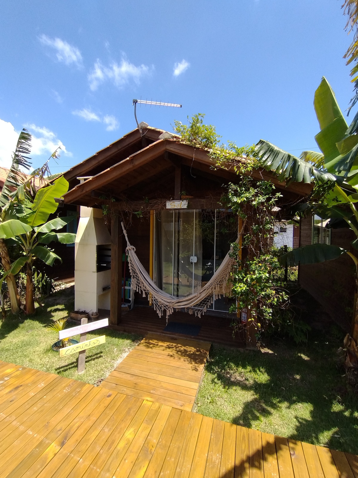 Supermysig stuga, perfekt för 2 personer. Vi tillhandahåller sängkläder, bad- och ansiktshandduk, strandstolar, fullt utrustat kök med kaffebryggare, brödrost, minibar och alla andra redskap. Den har kall luftkonditionering, individuell grillplats på balkongen, och ligger mycket nära allt, stranden 950 m (genom en stig framför stugan som börjar vid foten av Morro do Rosa Norte), 950 m till centrum, marknaden 200 m, och lagunen 1 200 m bort.