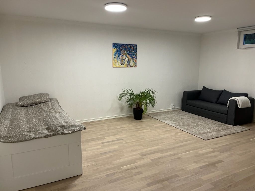 Inredd supermysig källarvåning med fri parkering, bastu, egen ingång Lugnt och trevligt villaområde mitt emellan Jönköping och Huskvarna. Närhet till stor matbutik, Vättern med bad och någon kilometer till ett vackert skogs och friluftsområde med aktiviteter och flera längdspår ”Öxnegården ” samt så finns ju sköna Vätterbankarna ännu närmre Även gångavstånd till Huskvarna Folkets park med konserter och andra evenemang, och gångavstånd till Elmia och Jönköpings konserthus.