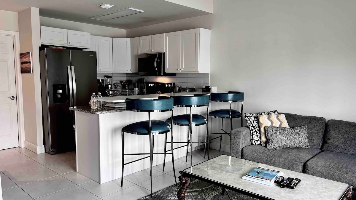 Cool ren modern fristad med utsikt över vattnet; en två sovrum/två badrum condo med ett fullt utrustat kök och vardagsrum packade med alla populära bekvämligheter (wifi, kabel-TV, Apple TV, Netflix, Playstation spelkonsol, central A/C, strykjärn och strykbräda, tvättmaskin och torktumlare, uteplats, pool och gratis parkering) - bekvämt beläget i Grand Harbour. The Shoppes at Grand Harbour, & Harbour Walk ligger intill. Perfekt för att utforska och njuta av allt som Caymanöarna har att erbjuda.