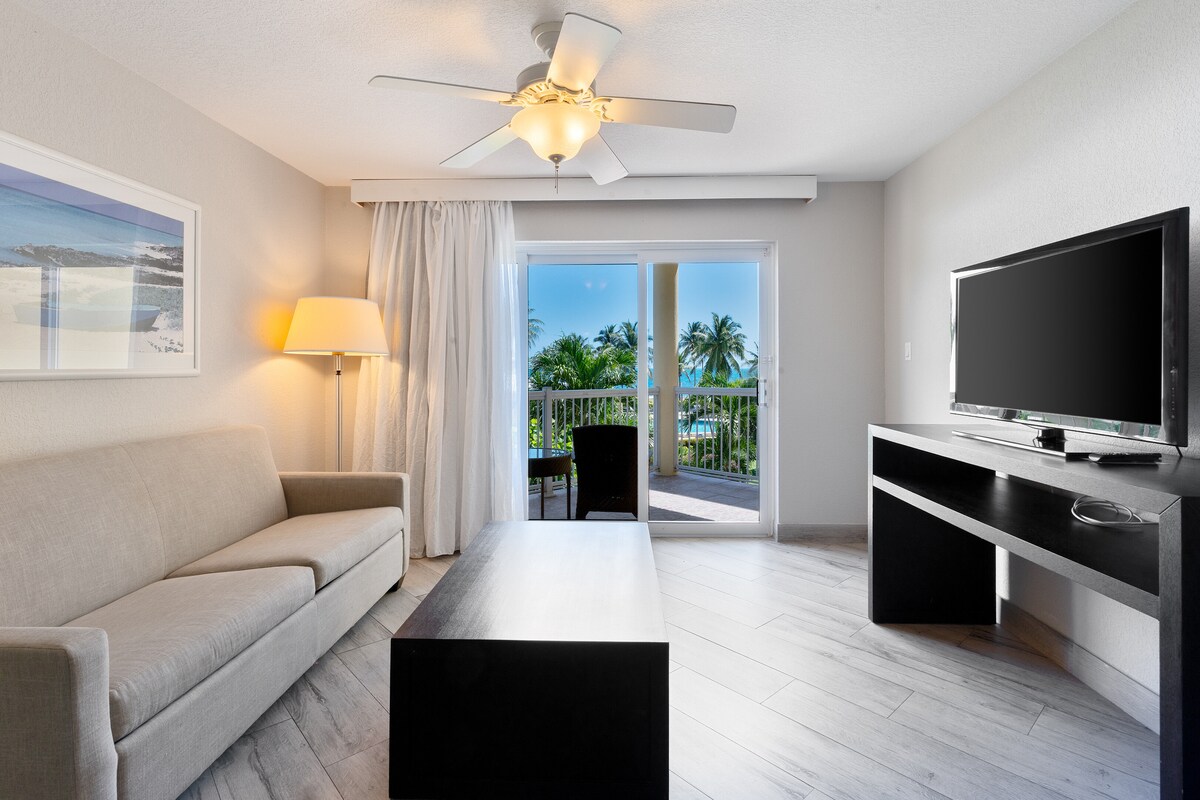 Ocean View- One Bedroom King Suite Spacious 900 sq. ft. suite with a private bedroom with king size bed and ensuite featuring a double vanity with walk-in shower. Includes a full kitchen, dining room, and living room with queen size sleeper sofa. Enjoy a private balcony or patio, flat-screen TV in bedroom and living room, in-room safe, coffee maker, microwave, full size fridge, oven, stove, iron, hairdryer, and more. Sleeps up to 4 adults or 3 adults and 1 child.