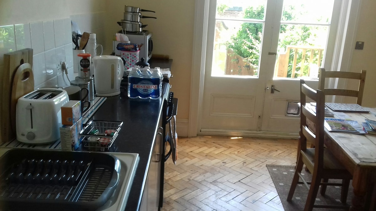 Rymlig lägenhet med periodiska funktioner. Härlig lounge med 2 soffor, vikfönster med havsutsikt. 55" Sky Glass TV, stort sovrum med lugn aspekt till bakre trädgården. Dubbelsäng och 1 hopfällbar säng med ordentlig madrass tillgänglig. Badrum med dusch över badkar. Ljust kök med dubbla dörrar till upphöjd uteplats, perfekt för morgonkaffe och trappor ner till stor privat inhägnad trädgård. Parkeringstillstånd tillhandahålls för gatuparkering utanför fastigheten