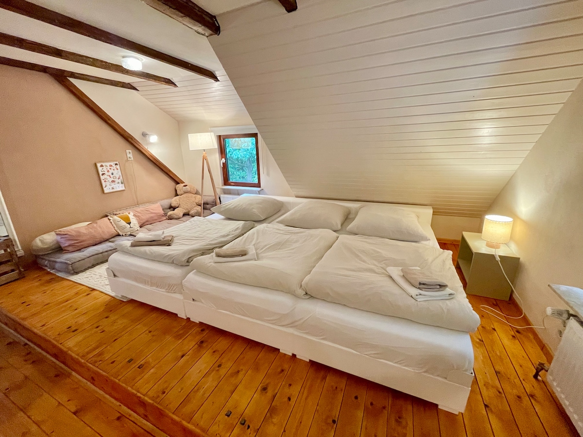 Lägenheten med fantastisk utsikt omfattar hela vindsvåningen i mitt hus. Den ligger i ett lugnt läge i Lamspringe precis vid skogsbrynet och är helt nyrenoverad. Den nås via huvudentrén via en separat (!) trappa. En fristad nära naturen. Sovrummet har en stor, mysig dubbelsäng (1,80 x 2,00 m) och det finns en bäddsoffa. Wifi, TV, radio tillgänglig, lägenheten är välutrustad. Liten uteterrass.