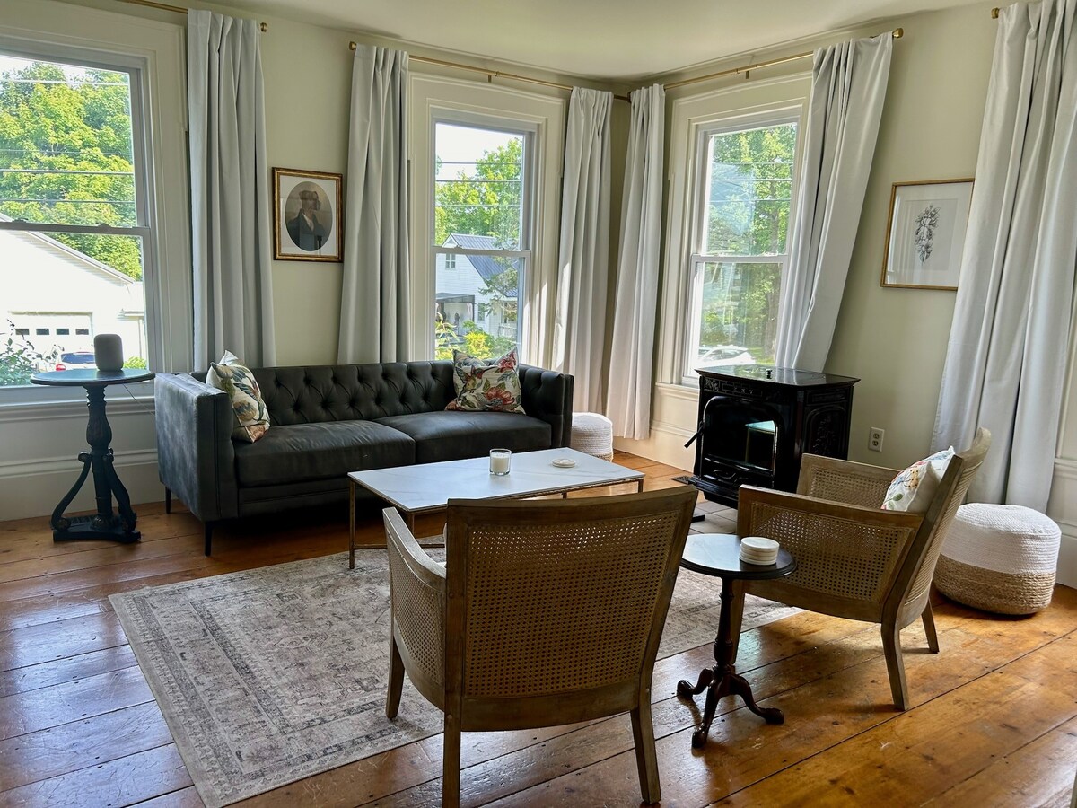 Vårt charmiga Airbnb ligger i hjärtat av Gardiner Maine. Vårt historiska hem byggdes 1850 och kombinerar gammal världscharm med moderna bekvämligheter. Njut av de knarrande trägolven, de exponerade balkarna och kustaccenterna som skapar en lugn, havsnära atmosfär. Den öppna planlösningen erbjuder ett rymligt vardagsrum med en bäddsoffa, Smart TV, böcker och brädspel. Vi erbjuder ett bekvämt sovrum med en dubbelsäng. Ett fullt utrustat badrum. Njut av matlagning i det fullt utrustade köket som öppnar upp mot en privat veranda.