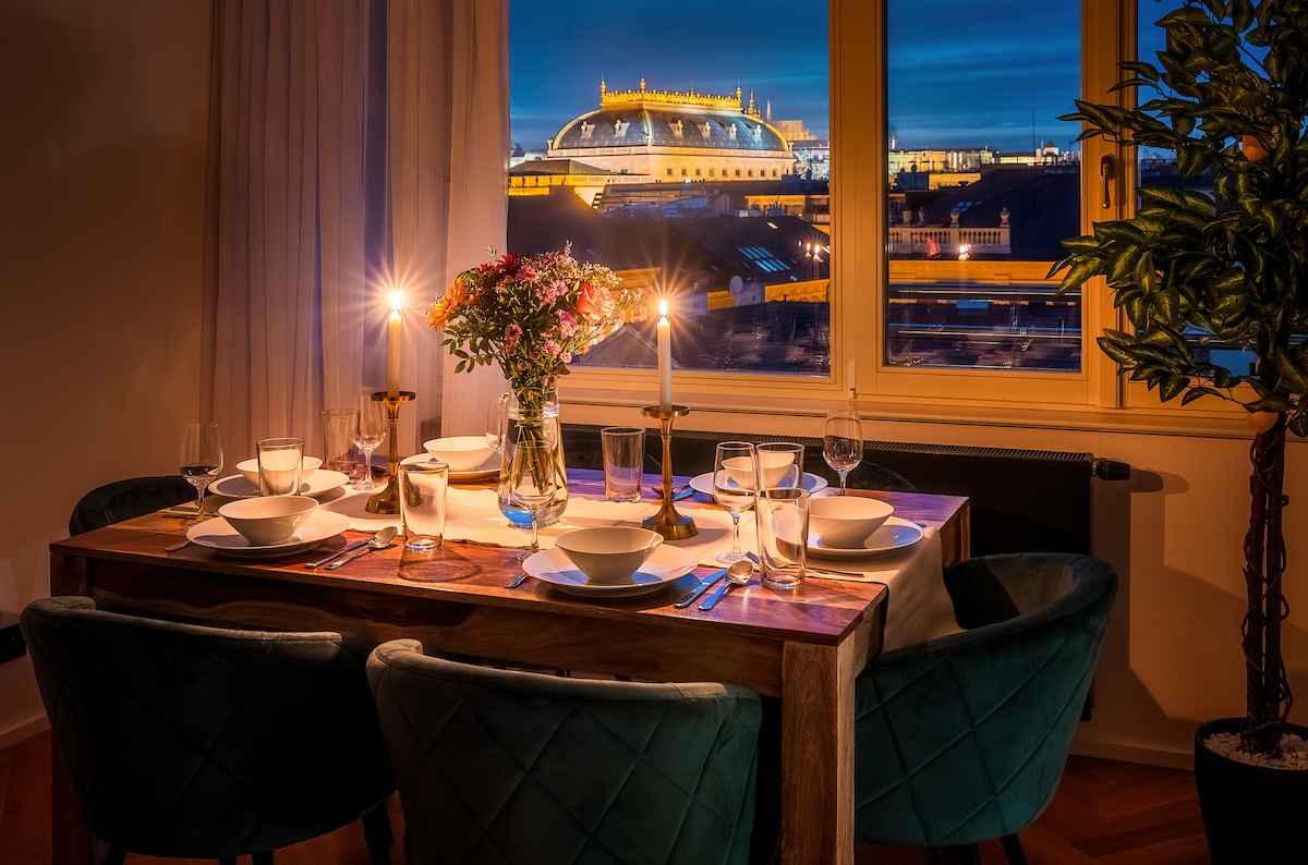 Ett helt underbart och otroligt vackert ställe. Rör vid himlen. Rör vid stjärnorna från takvåningen!!! Det är så extraordinärt att det brukade vara populärt även med utländska diplomater och filmstjärnor. Förutom komfort på en exceptionell nivå, erbjuder denna nyrenoverade och utrustade takvåning fantastisk utsikt över hela Prag och dess viktigaste sevärdheter. Njut av utsikten över Prags slott, Gamla torget och mini Eiffeltornet från den fantastiska jacuzzin direkt under stjärnan...