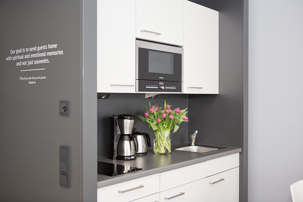Din studio ligger bredvid några andra runt ett rymligt vardagsrum. Din fullt utrustade studio är den perfekta platsen att koppla av efter en lång dag. Förutom det moderna badrummet erbjuder studion med det fullt utrustade köket inkl. kaffemaskin och en arbetsplats, allt du behöver för din vistelse.