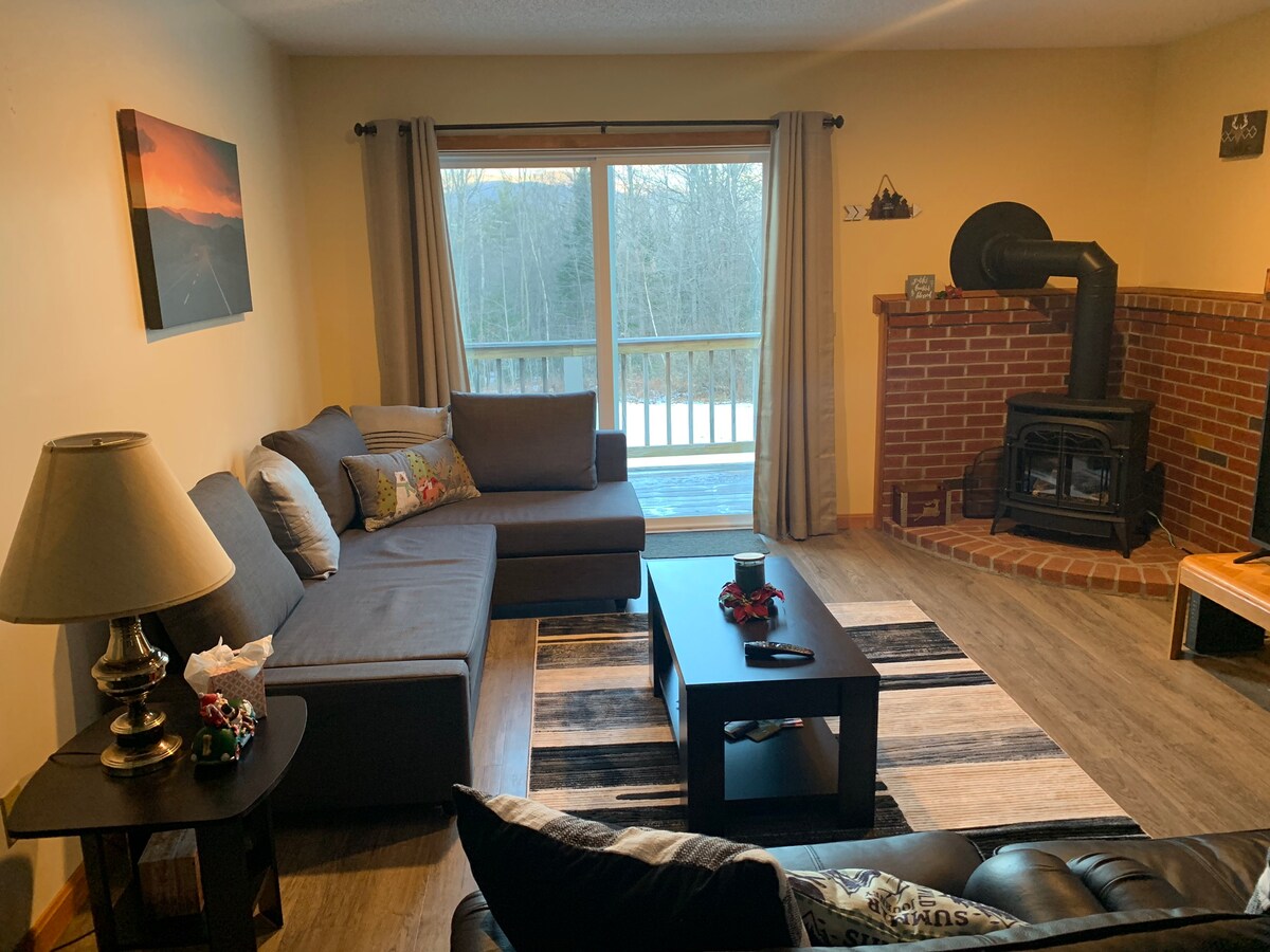 Den perfekta bergsresan väntar dig i denna lägenhet med 2 sovrum, 2,5 badrum med bubbelpool och utomhus-TV. Beläget ovanför White Mountain National Forest med utsikt över "Moat Mountains" med perfekt soluppgång och solnedgång från alla nivåer. Denna lägenhet är en perfekt tillflyktsort för familjer eller grupper på upp till 6. Perfekt beläget för en vandring eller cykling på de natursköna vandringslederna. Besök Storyland, Echo Lake, Attitash, Cranmore eller flyt nerför Sacco. Dessa attraktioner och många fler ligger alla inom några minuter!