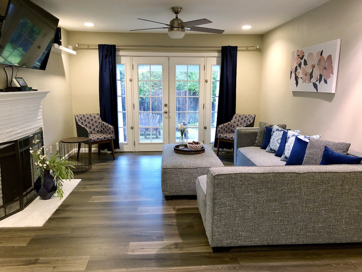 Helt ombyggt familjevänligt 3bed/2 badrum hem med lyxiga golv och höga valvtak som rymmer 10 personer! Inkluderar 2 personers uppblåsbar madrass och utdragbar soffa. Njut av detta utmärkta läge några minuter från topprankade restauranger, nattliv och Prime Shopping Center. Platsen har en 75" smart-TV och öppen spis med "The Simpsons" arkadspel. Varje rum har en bekväm queen-säng, fullt renoverat kök och lättanvända hushållsapparater, pack n play för spädbarn och mycket mer. Ha en trevlig vistelse!