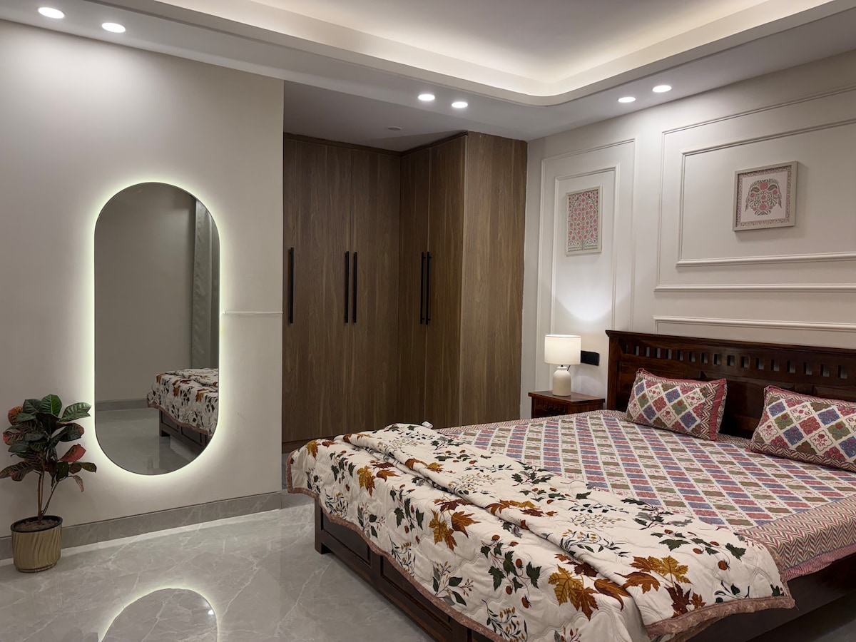 Perfekt för ensamstående affärsresenärer på korta vistelser LÄS ALLA HUSREGLER NOGGRANT En lyxklig, rymlig och mysig, oberoende Studio i ett lugnt grannskap i hjärtat av staden. Fullt möblerad med 1 sovrum i king size Eget badrum Fullt utrustat vardagsrum med dedikerad arbetsyta Skafferi med minikylskåp och mikrovågsugn. Egen balkong i anslutning till arbetsytan. Vackert anlagd terrass som erbjuder utsikt över den vackra Sanjay Van Biodiversity Park och Qutab Minar.