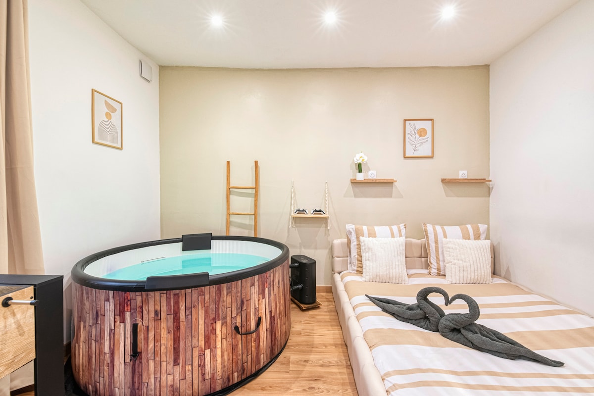 Välkommen till Instant à deux, upptäck vårt privata loft på 45 m² med ett 2-sits balneobadkar, bastu och hängmatta. Loftet inkluderar ett stort badrum som består av en dubbel XXL-dusch, ett fullt utrustat kök, en stor säng (160 x 200) med kvalitetssängkläder. golvet är utrustat med en tantrafåtölj. En stjärnhimmel kommer att accentuera avkoppling och välbefinnande under din vistelse. Säng bäddad vid ankomst, badrockar och handdukar tillhandahålls.