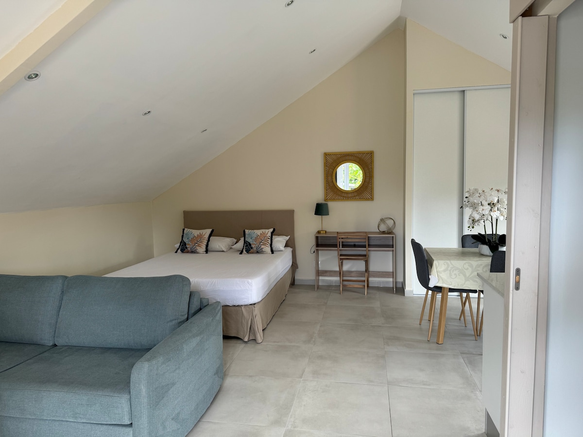 Stor studio "hotellrumsstil" mysig, modern och funktionell, i området Camélias, och nära till alla bekvämligheter. Självständig in- och utcheckning. Perfekt för 2 personer, den rymmer 2 extra personer i en bäddsoffa med en riktig säng. ➡️ wifi ➡️ Utrustat kök ➡️ Matplats för 4 personer ➡️ Smart-TV + dekoder ➡️ 1 terrass + 1 balkong ➡️ 1 komfortsäng 160 x 200 ➡️ Dusch + handdukar tillhandahålls. Bo i en lugn och trevlig miljö