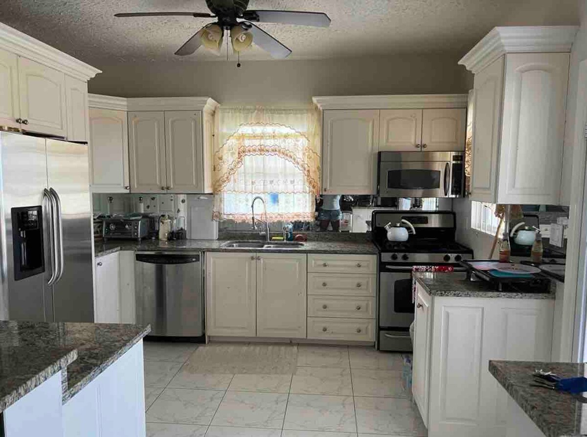 Gå uppför trappan och se hela vägen genom villan, till ytterdäcket med pool, och bortom till vidsträckt utsikt över Karibiska havet! Köket har vackra anpassade skåp, bänkskivor i vit kvarts, alla nya apparater och en ö med sittplatser för fyra. Uteplatsen har en gasolgrill och bord för sex samt bekväma utemöbler. Reservgeneratorn håller allt igång felfritt. Detta hus ligger i det önskvärda Jones Estate grannskapet .