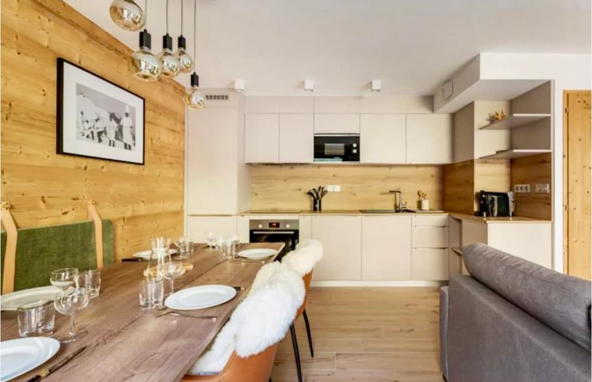 Lägenhet 12 ligger 1 km från centrum av Morzine och har fantastisk utsikt söderut över staden och bergen och är tillgänglig via trappan eller hissen. Med ett kök i öppen planlösning, matplats och vardagsrum med två dubbelrum, ett litet rum med våningssängar för två personer och en bäddsoffa. Det är perfekt för upp till 8 personer, men för säkerhets skull också en utdragbar säng som kan användas för en extra gäst och resesäng för en bebis. Det finns säker cykelförvaring och ett skidskåp