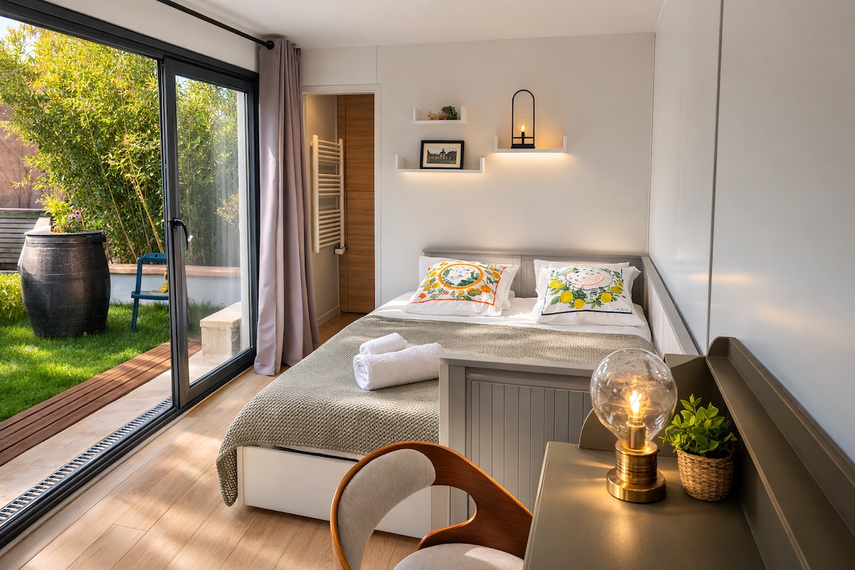 Beläget 30 minuter från Arcachon-bassängen, 40 minuter från det historiska centrumet i Bordeaux och 15 minuter från Mérignacs flygplats, välkomnar denna charmiga träsvit på 18 m² dig i en modern och varm inredning. En privat terrass utrustad med en Weber gasolgrill och en laddningsstation för elfordon (januari 2023) är ett plus för din vistelse. Sängkläder 140 cm, sängkläder, TV via wifi (Canal Plus, Netflix tillgängligt) Utrustat kök med mikrovågsugn, spishäll, kylskåp, kaffemaskin.