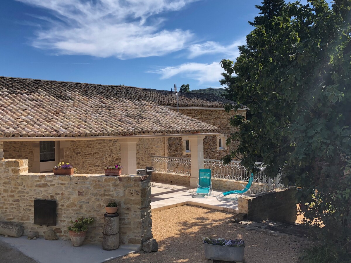 *** Juli och augusti: endast söndag till söndag. Denna vackra provensalska Mas erbjuder bekväm sömn och avkoppling för 8. Det är en gammal, autentisk stenbyggnad bland vinrankor och lavendelfält, med fantastisk utsikt över Ardêche, fantastiska solnedgångar och en pool. Huset är väl lämpat för familjer eller en grupp vänner. Inomhus och utomhus finns gott om utrymme för människor att sprida ut sig, samtidigt som det finns bra utrymmen för att spendera tid tillsammans. Det är en perfekt blandning av mysigt och rymligt.