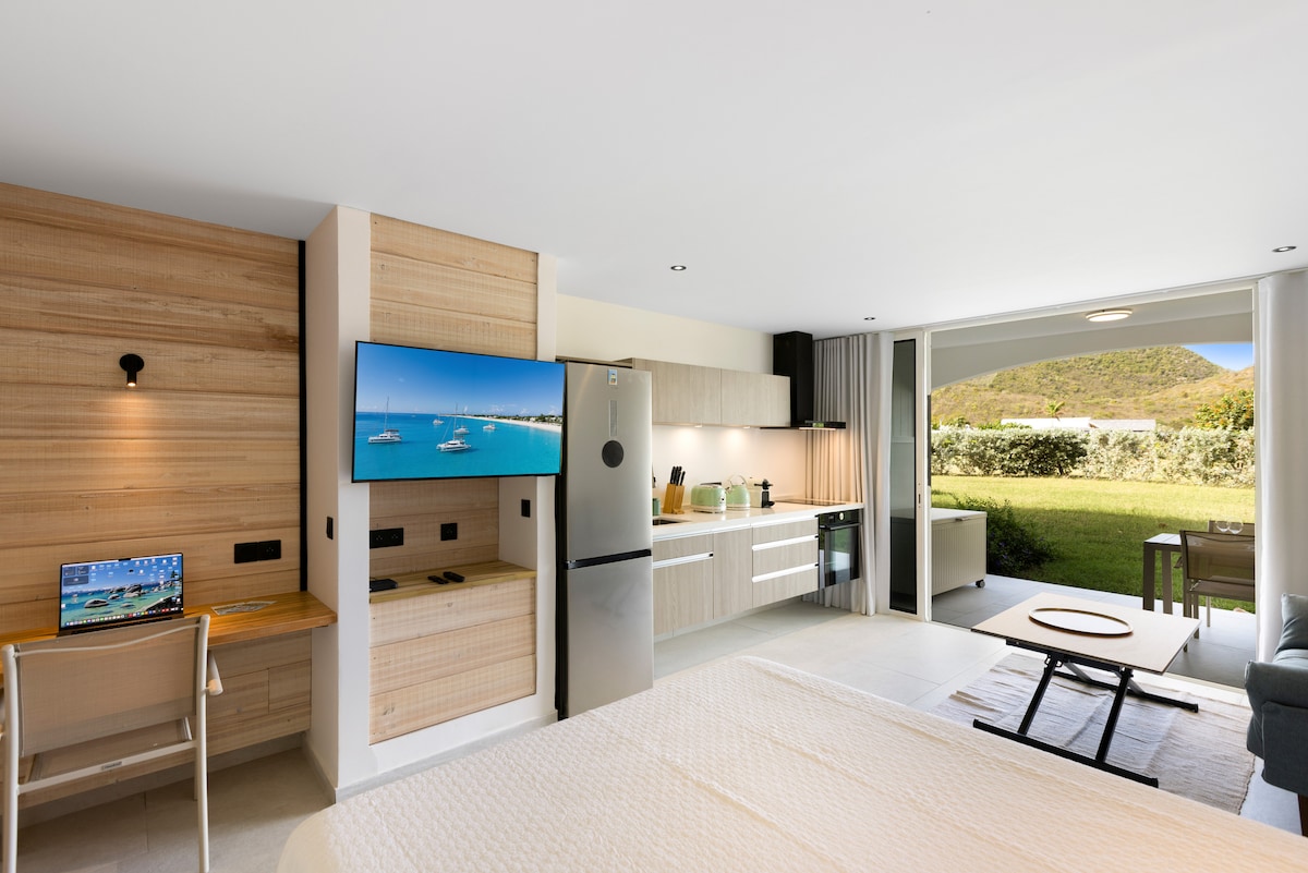 En elegant modern enrumslägenhet direkt belägen på den vackra vita sandstranden i Simpson Bay. Njut av det kristallklara vattnet på dagen och utforska den karibiska charmen i vårt livliga nattliv. Vår öutflykt ger dig den fulla avkopplingsupplevelsen komplett med strandstolar, parasoll, utomhusdusch, snorkelutrustning och paddelbrädor för att komplettera strandupplevelsen Bekvämligheter inkluderar gratis WIFI, kök, dubbelsäng, strandstolar, paraplyer och mycket mer