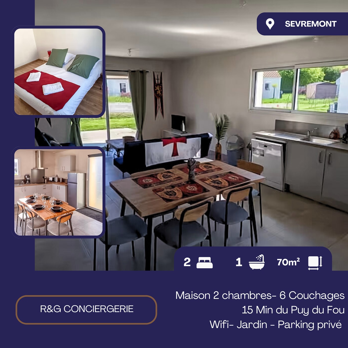 Idéalement située à 17 min du Puy du Fou 25 min du 1er Parc Européen de Jardins Japonais 40 min Marais Poitevins/Venise Verre 1h15 de La Rochelle, de l’ile de Ré, de la côte vendéenne. 1h30 du Futuroscope Proche Festival de Poupet À côté:supérette, pharmacie, boulangerie, restaurant, bar, structure de jeux pour enfants Terrasse/jardin/barbecue Entrée autonome avec boîte à code afin d’arriver à l’heure que vous souhaitez Peut accueillir 6 personnes+ bébé
