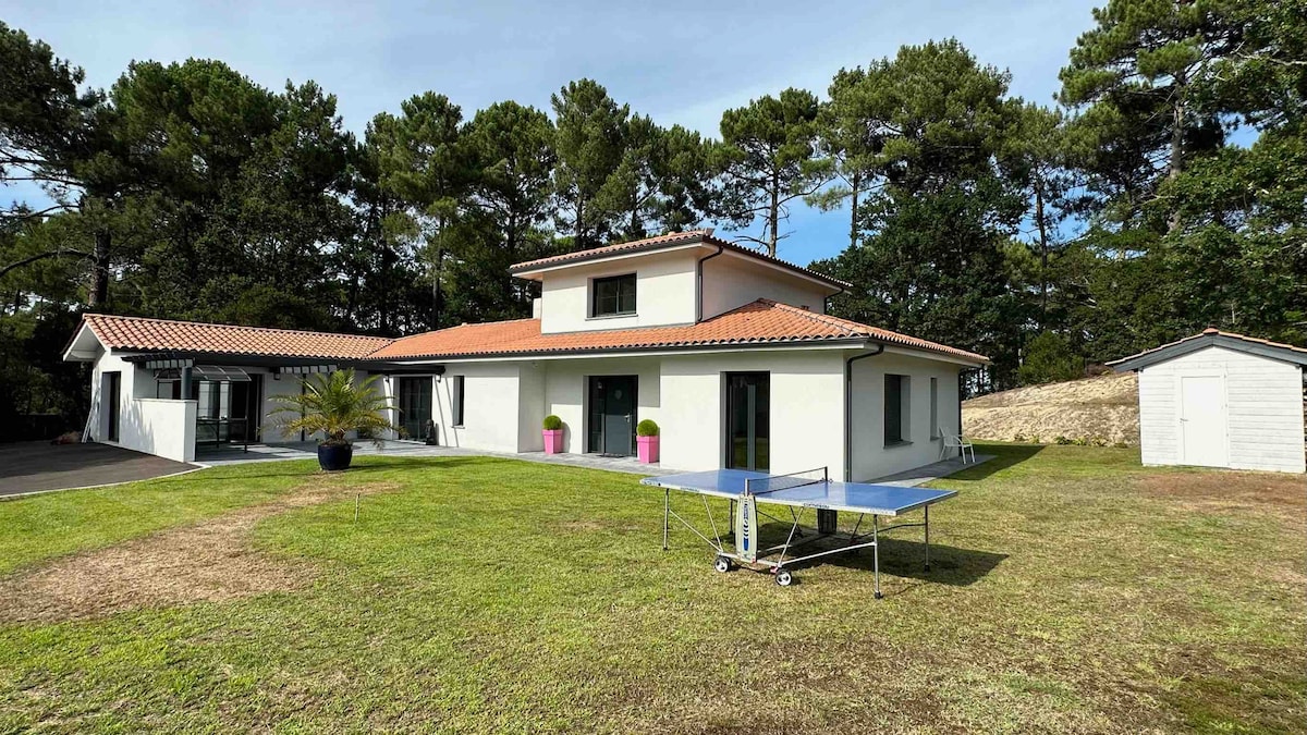 Nytt hus omgivet av skog bredvid cykelvägen och stränderna på Landes-kusten Den består av ett vardagsrum med öppet kök, 3 sovrum inklusive 1 master suite med badrum och toalett, och slutligen ett annat badrum och separat toalett. Internet via fiber 🛜 Utanför finns en pool på 4 x 8,5 m som vetter söderut och som är uppvärmd från april till 11 november, med en anlagd trädgård och 110 m2 träterrass. Strand och golf i Moliets och maa 10 min Vieux boucau 15 min Hossegor 28 min. Biarritz 50 min