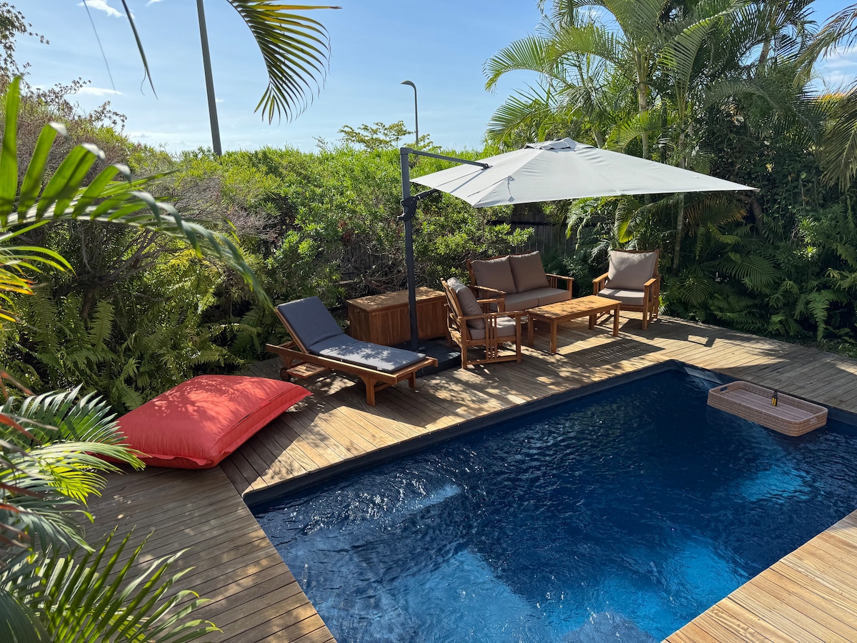 Bottenvåningen oberoende av en cell på styltor, belägen i en kokosnötslund. Schemalagd för 2 personer, den består av: - ett sovrum, ett utomhusbadrum (varmt vatten) och toalett, ett utrymme öppet på utsidan med utrustat pentry och en trädgård med jacuzzi och pool. Beläget vid havet i Saint Paul Bay i ett exceptionellt naturreservat (kokosnöt lund och damm), nära centrum shopping, Saint Paul Market och Tamarins Road. Lugnt läge.
