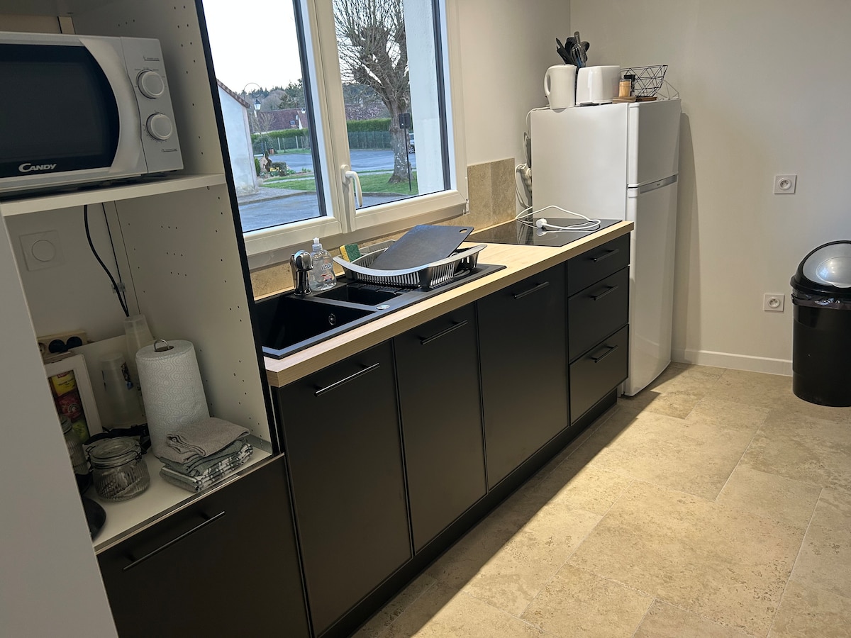 2,5 timmar från Paris, i hjärtat av Alpes Mancelles, kom och njut av ett litet hus i en by med alla bekvämligheter, på en privat park med gäss, åsnor, ponny och getter. Perfekt för en familj. På bottenvåningen finns ett vardagsrum med pelletsbraskamin, bäddsoffa och fullt utrustat kök. På övervåningen finns ett sovrum med dubbelsäng, ett andra sovrum med våningssäng och duschrum. Det renoverades helt i januari 2018,