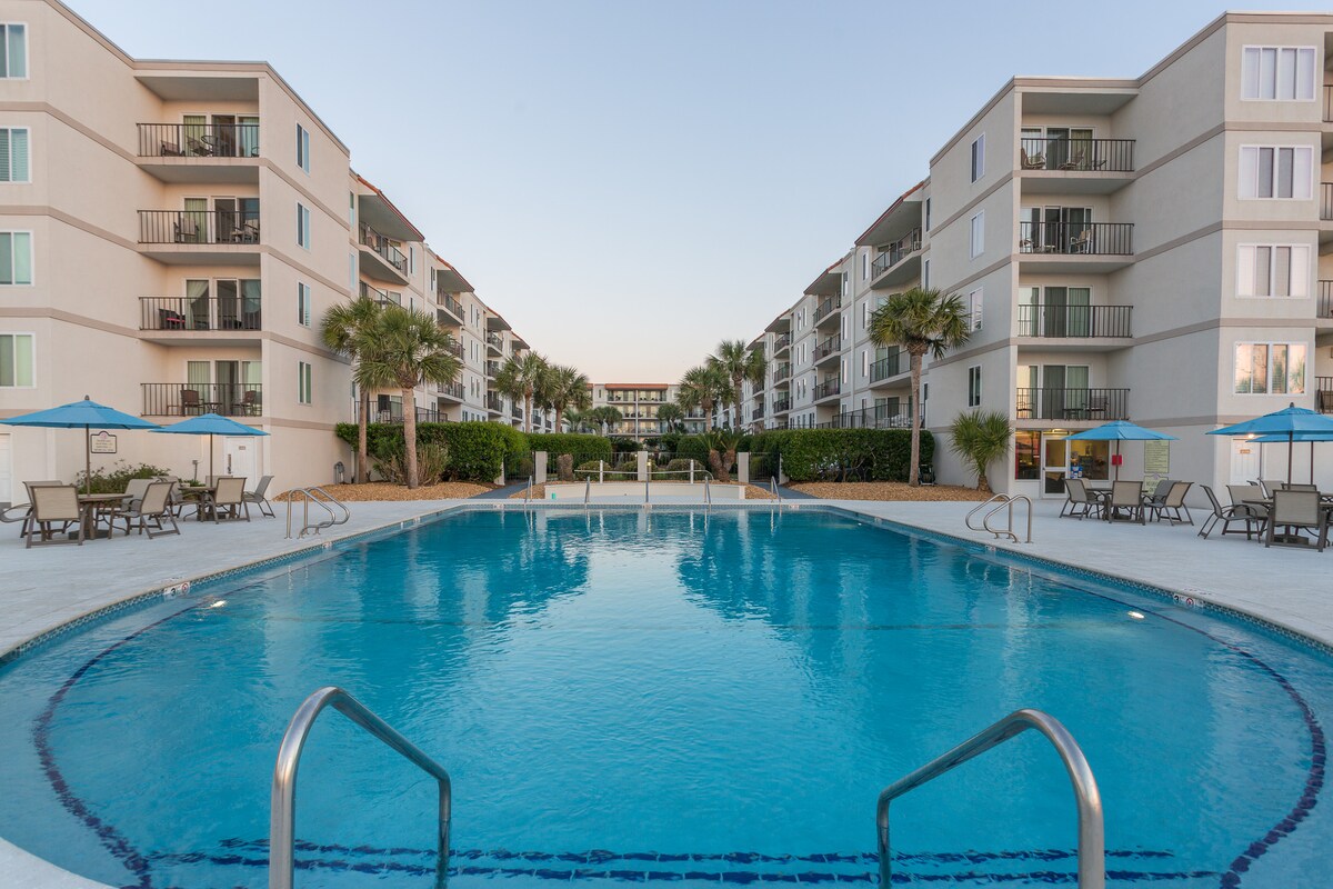 Denna rymliga lägenhet ligger på södra änden av ön och är bekväm för shopping och restauranger. Fem korta minuter till stranden, fiskepiren, fyren, byn och golfbanorna. Har vackert renoverats med alla bekvämligheter hemifrån. Pool mittemot din ytterdörr. Fantastiskt soldäck utanför sovrummet. Inhägnad uteplats för avskildhet för att varva ner efter att ha utforskat allt som ön har att erbjuda. Perfekt semester för familj och vänner