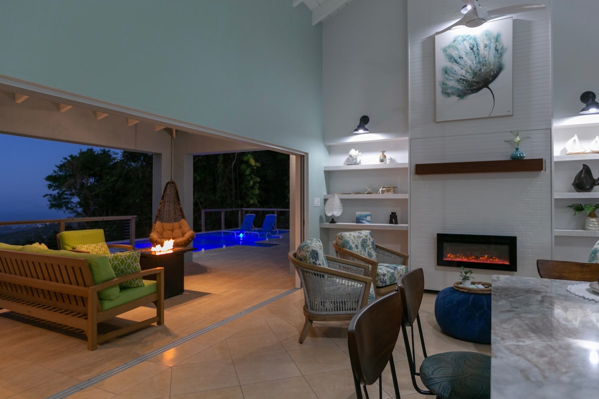Escape to Sunrise Villas by Stacie, a private tropical mountaintop retreat in St. Thomas. Enjoy panoramic ocean views, a heated pool with Baja sun deck, jets and lights, plus elegant indoor-outdoor living area with 20-ft sliding doors, gourmet kitchen, bar, and fireplaces. With a whole-home generator, comfort is guaranteed. Perfect for couples, families, or friends—book the villa next door for up to 4 more guests. Includes beach chairs, cooler, and Cressi snorkel gear for perfect beach days!
