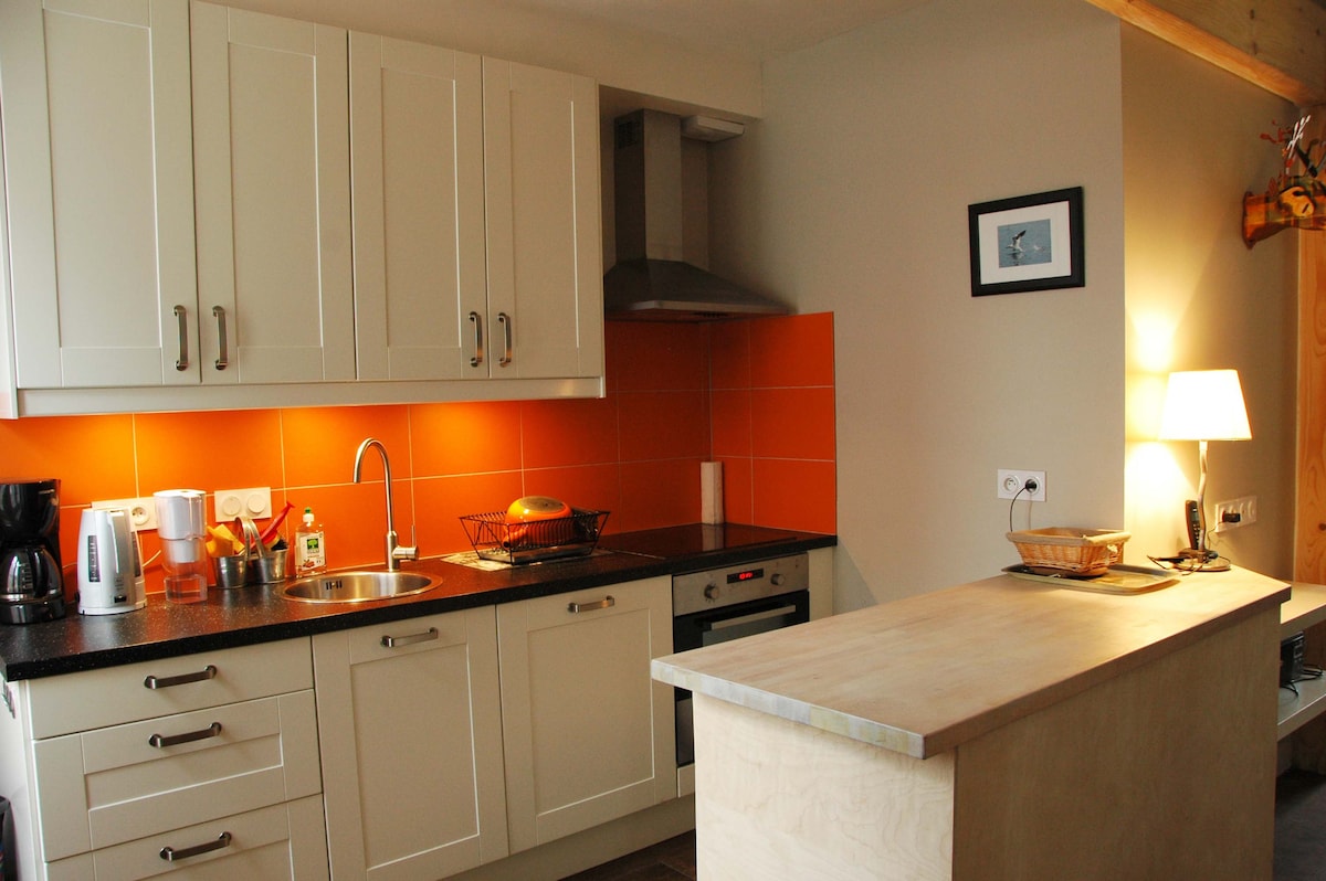 På stranden i Reville Jonville på trädgårdsnivå i gästhuset, denna moderna ombyggnad är inrättad på en hög nivå, med golvvärme, ett välutrustat pentry med bar/matplats och duschrum med toalett. Fönstren vetter söderut och västerut och har utsikt över terrassen. Området är idealiskt för lugna vistelser med utsikt, men det finns ingen brist på aktiviteter: landningsplatser, promenader, cykling, vindsurfing, golf, etc. Vi talar GB, F, D.