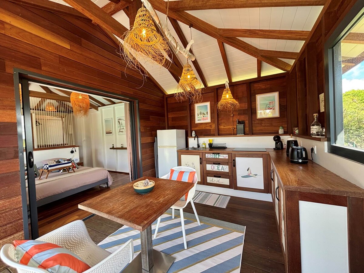 I hjärtat av en tropisk trädgård, på höjderna av Sainte-Marie, bjuder vår stuga in dig till en atmosfär av "slow life", med den bästa komfort, på en lugn plats, badad i solsken, full av inspiration. Med utsikt över Atlanten kan du urskilja "Tombolo", staden och den gröna dalen. Några kilometer från vulkanen Pelée, floder och vattenfall, kommer din rutt att ta dig till destillerier och magiska hörn i norra delen av vår ö som kallas "blommornas ö".