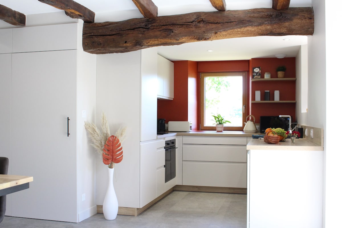 Välkommen till mina farföräldrars bondgård som jag har renoverat sedan 2013! Huset ligger mitt i staden och är 100 m2 . Den är utrustad för att du ska känna dig som hemma direkt. Mycket tyst och fridfull miljö. Wifi. Butiker inte långt bort. Huset är ljust och mycket väl isolerat. På vintern tillåter eldstaden uppvärmning till 22 grader och trä tillhandahålls. Två parasoll sängar är tillgängliga på begäran samt all barnomsorg och leksaker.