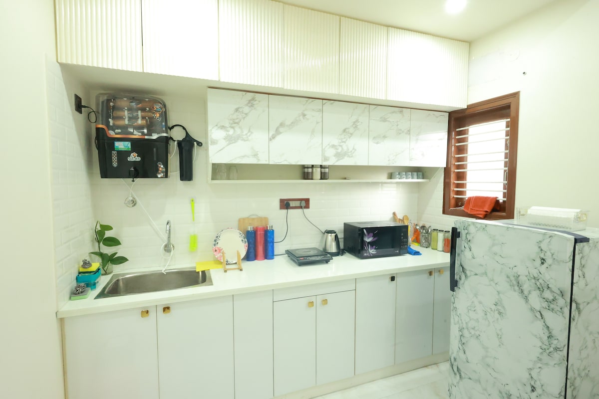 Bo i vårt helt nya 1BHK i Electronic City Phase 1, bara 2 minuter från Neeladri Road. Detta mysiga boende ligger i en lugn och fridfull gränd och är perfekt för två, familj, ensamresenärer eller par. Njut av pastellfärgad inredning, snabbt WiFi, ett fullt utrustat kök, matplats, hiss, strömbackup och en 40-tums smart-TV där du kan Netflix och chilla. Perfekt för arbete eller fritid, med kaféer, butiker och teknikparker i närheten. En säker, lugn byggnad med allt du behöver för en bekväm vistelse.