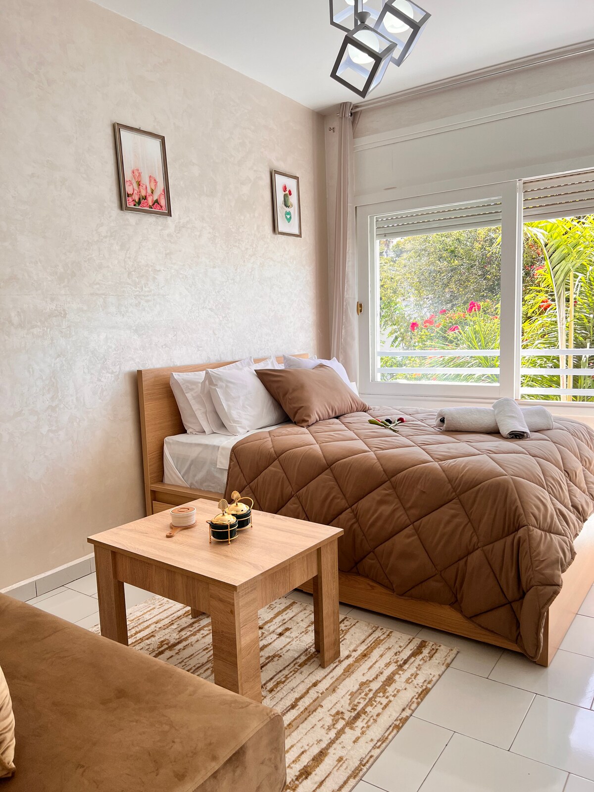 - en modern renoverad studio med hiss mitt i grönska i centrum av Rabat - Fiberoptik , Netflix ، TV-handduk, schampo... - En stor och liten handduk för varje vistelse. - nära alla bekvämligheter: närbutiker, bageri, kaféer och restauranger i närheten. - Tågstationen ligger 10 minuter bort, turistplatser i staden. - Spårvagn 10 minuter bort. - 15 minuter från flygplatsen. Fullt utrustat kök. - en dubbelsäng och en liten soffa att sitta på Välkommen
