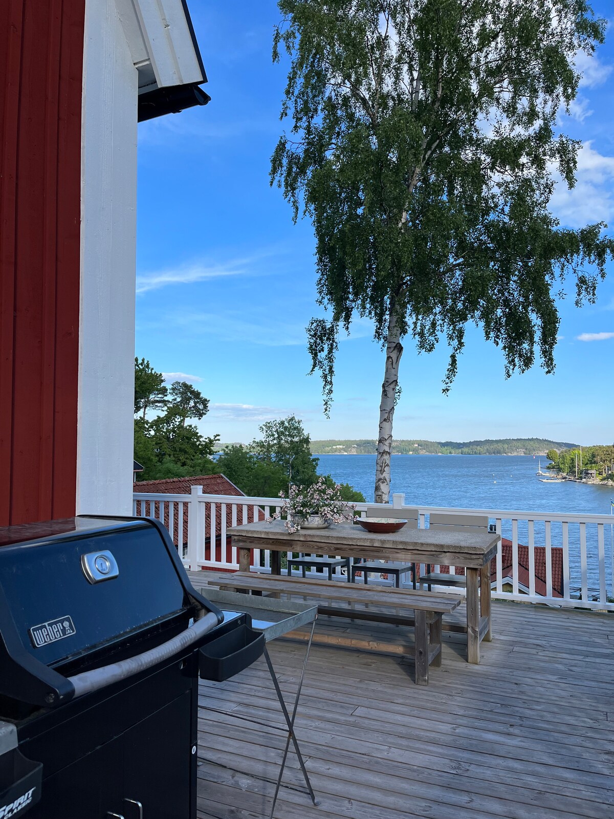 Guesthouse by the sea on a quiet point. Bathrobe distance to a dip in the ocean. Enjoy sun all day. Possible to borrow SUP board and if you come for a sailing event with your own RIB/dinghy you can park it at the dock shared with the neighbour. I have some bicycles you can borrow as well. Small kitchen with microwave, small stove, air fryer and refrigerator with small freezer. 700 m to commuter train towards Stockholm. You can park your car for free on the property.