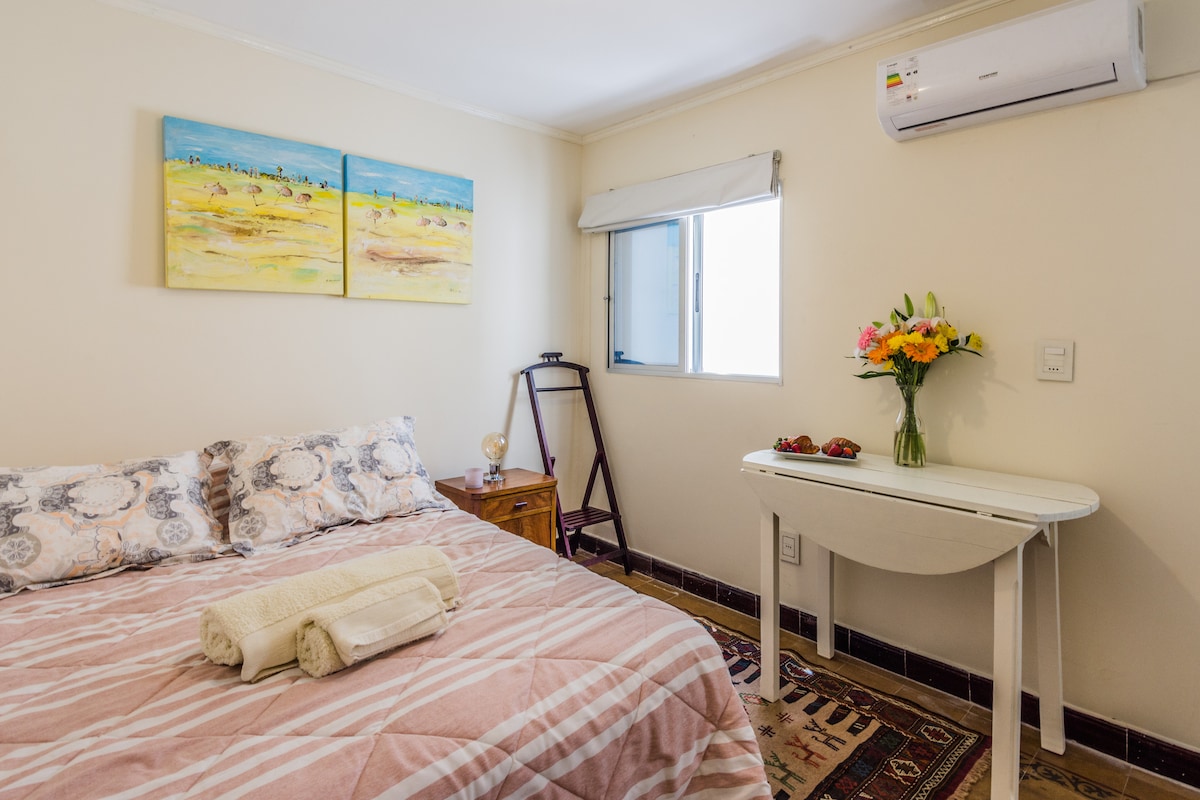 Ljust hus i lugn gata i Pocitos. Luftkonditionering (varm / kall) i sovrum och vardagsrum 10 min. promenad till stranden, 5 min. av Parque Rodó. Fullt renoverat, utrustade med allt du behöver för en bekväm vistelse (ingår tvätt) Antag 2 extra gäster med dubbel bäddsoffa Amerikanska systemet, i separat hall, som ger integritet under natten. Barnvagga utan kostnad. Byte av sängkläder och handdukar, för vistelser över 7 nätter. Trädgård och egen parkering.