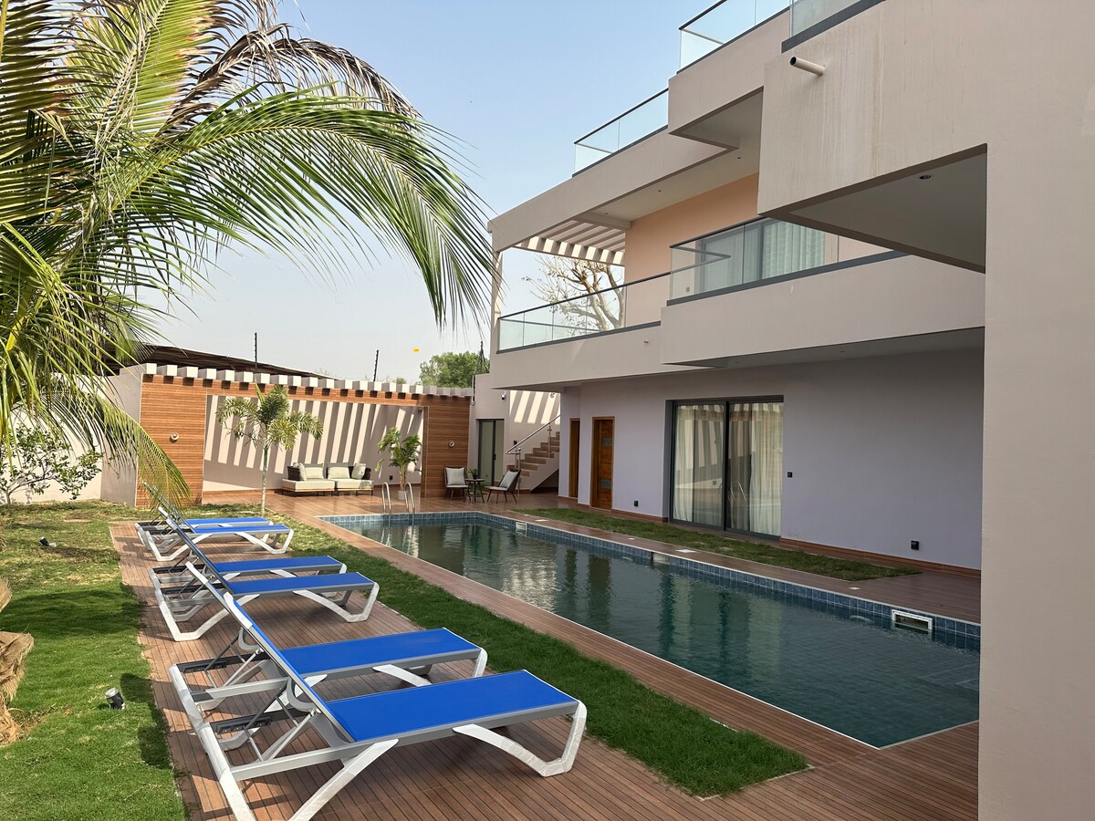 Chic och raffinerad villa i Keur Samba, Malicounda, 2 minuter från motorvägen och nära Saly. Tre stora sovrum med privata badrum, stort ljust vardagsrum, modernt kök, fantastisk takhöjd och pool i en blommig exteriör. 30 minuter från flygplatsen, 10 minuter från stränderna, perfekt för att utforska Bandia, Somone, Saloum. Perfekt för familjer, vänner eller arbetsvistelser. Ytterligare tjänster: hemlagad mat, flygplatstransfer, utflykter och guidade turer. Förbetald elektricitet