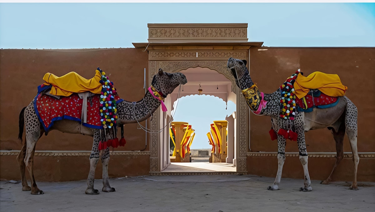 Obs: ☝️ Klicka på "Visa original" ovan ⬆️ för att se 👀 rätt information. ☞ Denna ökenretreat blandar Rajasthan-arv med modern lyx. Njut av kamelsafari, levande folkmusik, kulturella föreställningar, DJ-kvällar och mysiga brasor under ökenhimmel. Njut av autentiska Rajasthani middagar och frukostar. Perfekt för familjer, par och äventyrssökande – en oförglömlig resa av komfort, spänning och kulturell skönhet.