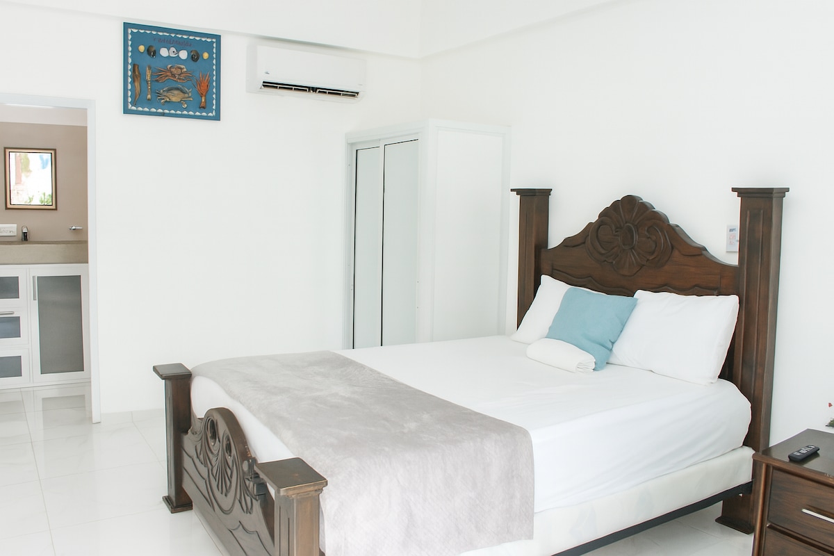 Escape to paradise at our newly renovated, spacious boutique hotel. Our eco-friendly hotel is steps from the beach in the heart of Las Terrenas! Wake up to stunning ocean views, unwind by our luxurious three-tiered pool surrounded by palm trees, or feel the ocean breeze as you relax in the sun. With tropical serenity, modern luxury, and the beach just minutes away, your perfect getaway awaits! The Suite Includes a king size bed, ensuite bathroom, and air conditioning.