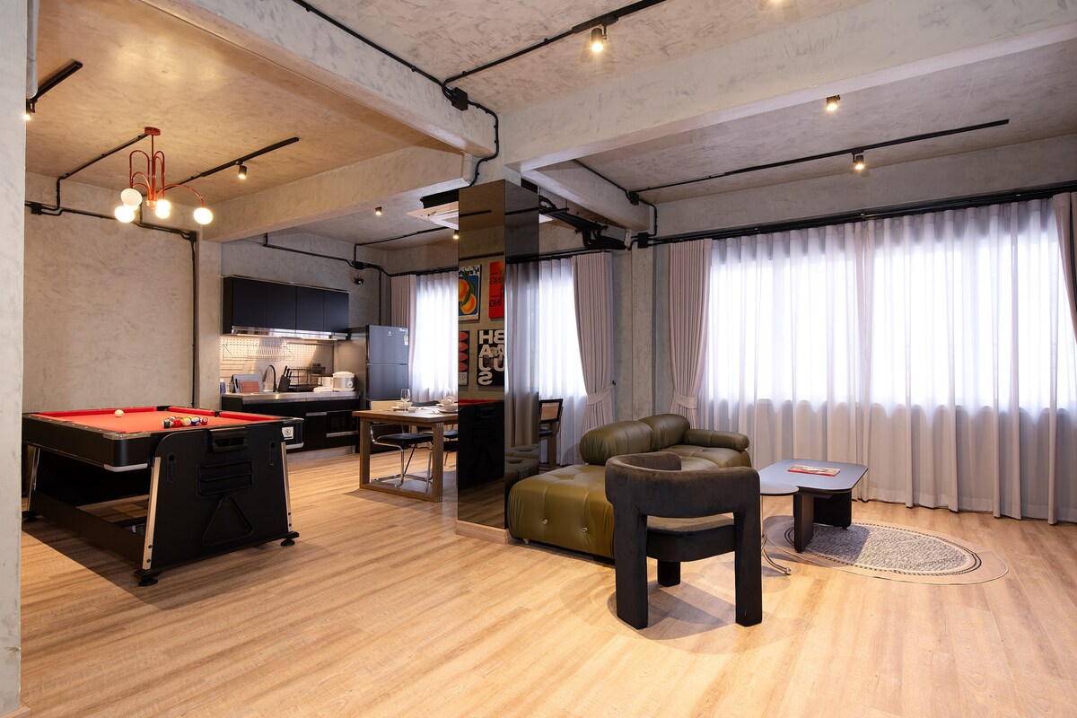 Koppla av i vårt fridfulla, genomtänkt utformade radhus. Denna konstnärliga vindsvåning har ett toppmodernt kök, rymliga sovrum med stora garderober, lyxiga dubbla regnduschar, PM2.5 ACs och en 75" TV med videospel. Omgiven av kreativa detaljer som konst, poesi och fotografi är det en oas av komfort med allt du behöver. Njut av höghastighets-Wi-Fi, dubbel belysning och valfri transport för en smidig vistelse.