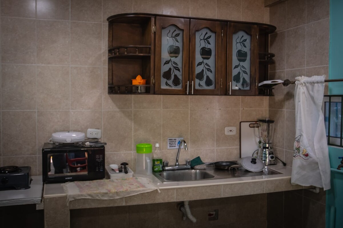 Mysig lägenhet en halv kvarter (30 m.) från de bästa stränderna i San Andrés, i mitten av ön. Den har en dubbelsäng, en extra enkelsäng under dubbelsängen, integrerat gaskök med alla redskap för matlagning och servering, kabel-TV, mikrovågsugn, kylskåp, luftkonditionering, garderob och privat badrum. Lägenheten har ett litet fönster bredvid köket som har utsikt över byggnadens interiör. Yta 20 m2