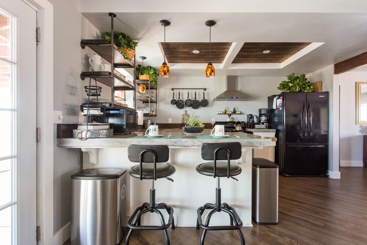 Lugn och lugn genomsyrar denna designjuvel i hjärtat av Joshua Tree. Ramble parken på dagen, ladda under stjärnorna på natten i detta Zen-inspirerade hem med helt inhägnad trädgård, jacuzzi, utomhusdusch, inbyggda uteserveringar och samtalssittplatser, eldgropar, babblande damm, vintage möbler från mitten av århundradet, full öppen planlösning Kök/ matsal/ vardagsrum, 2 Cal-King egna sovrum, Sun Room och Tvätt – alla badade i solljus och inom några korta kvarter från Joshua Tree Village.