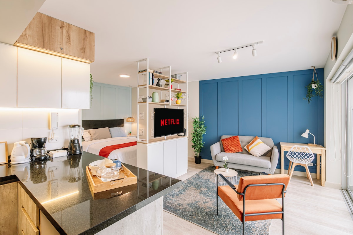 Ett raffinerat designloft med utsikt över skylinen och en frodig grön balkong – skapat för gäster som värdesätter lugn, design och enkel komfort. Två eleganta sviter och 2,5 designerbad, kurerad inredning och varm belysning skapar en boutiquehotellkänsla. Njut av ett fullt utrustat kök, snabbt WiFi med backup, Smart TV, tvättmaskin/torktumlare och SUV-parkering på ett utmärkt, gångavstånd från Kennedy Park, kaféer och havet.