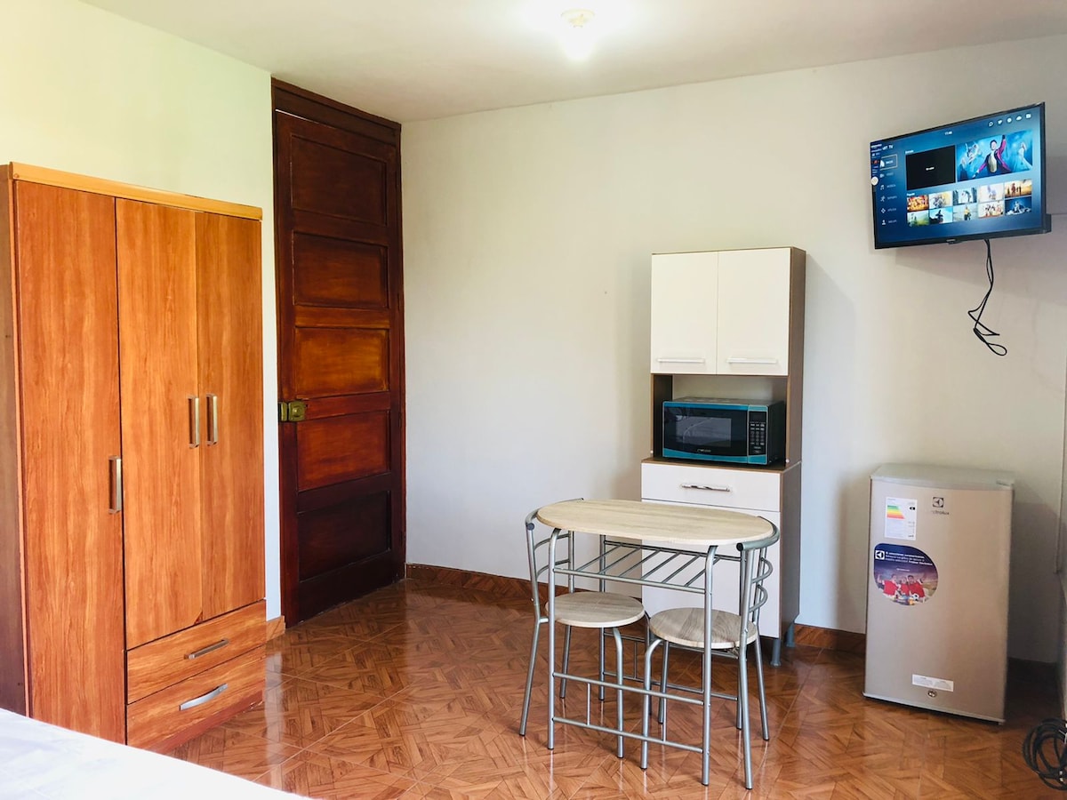 35mts2 rum med kök i 4:e våningen med separat ingång, möblerad (dubbelsäng, dubbel modulär möbel, byrå och garderob) har 42" Smart TV med NETFLIX och kabel, kylskåp, spis, vattenkokare, mixer, brödrost, risgryta, dusch med varmvattenberedare, wifi, köksredskap (glas, koppar, tallrikar, bestick), vi tillhandahåller också handdukar och badhanddukar.