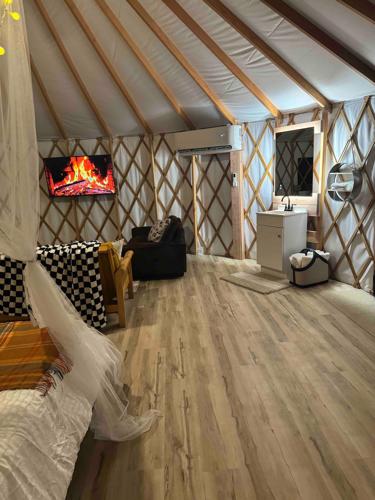Omge dig med naturen när du bor på vår Serenity Yurt, som ligger i en liten glänta på 20 skogbevuxna tunnland. Det har ett underbart takfönster, många fönster och vacker belysning. Mysigt att samlas, men utrymme att sprida ut sig. Fantastisk energi! Inkluderar gasspis, minikylskåp, mikrovågsugn, vatten på flaska och upp till sex vadderade barnsängar. Lägg till sängkläder och kuddar 35 dollar/set, övernattande gäster 55 dollar vardera, förhandsgodkända husdjur 35 dollar vardera. Om du vill lägga till extra gäster under dagen kan du be om prisinformation.