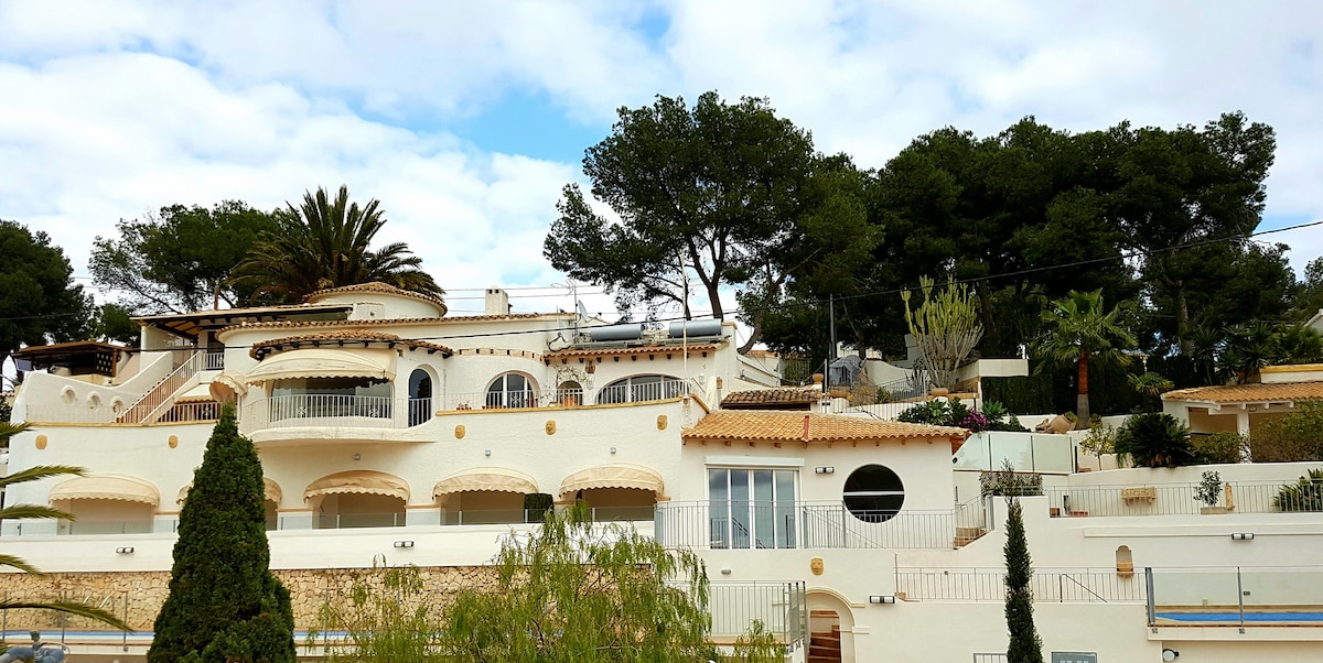 Luta dig tillbaka och koppla av i detta lugna, eleganta boende. Beläget på ett vackert underhållet, lugnt komplex i ett mycket soligt läge för att njuta av sol året runt. Fullt utrustat kök, rymlig lounge som leder till härlig uteterrass, 2 stora sovrum och fantastiskt badrum. varm och kall luftkonditionering, snabbt WiFi, smart-TV med full TV-tittande, härlig gemensam pool i ett lugnt komplex, beläget nära 5* Swiss Hotel och gångavstånd till Bar 21 Bistro, 2 minuters bilresa till Moraira Village.