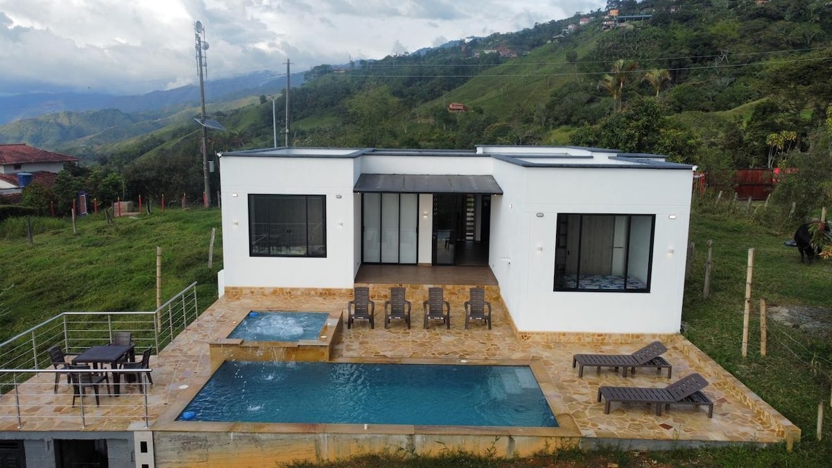 Koppla av från stadens stress medan du njuter av en charmig solnedgång, vårt vackra hus ligger 15 minuter innan du når San Jerónimo (Medellín-San Jerónimo) i ett mycket lugnt och säkert bostadsområde, det har ett välutrustat kök där du kan njuta av en vacker utsikt medan du förbereder din mat, vi har också en jacuzzi med varmt vatten som du kan njuta av hela natten, vi väntar på dig med öppna armar!!!