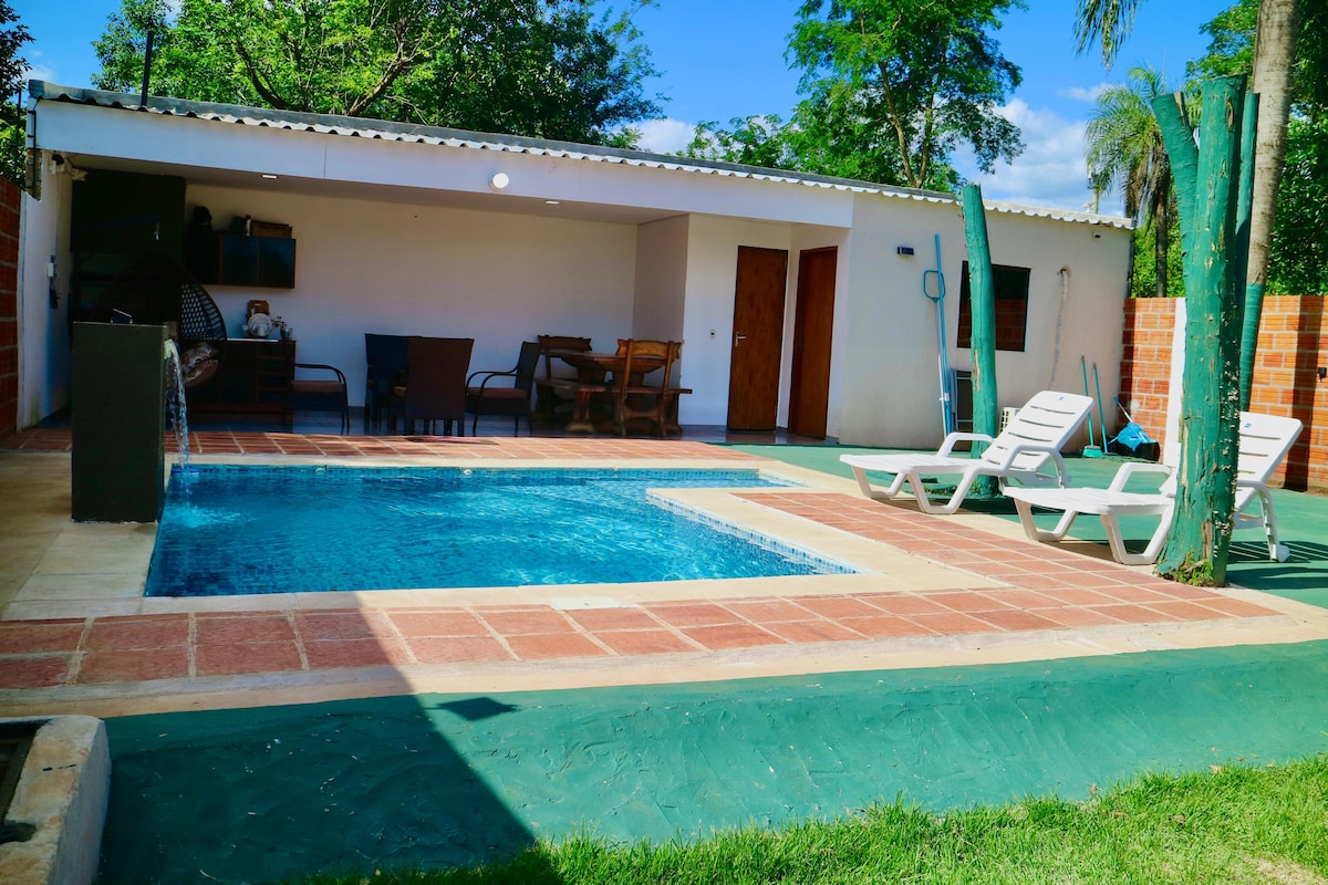 Helt privat mysig familjär stuga design för att fly från staden och koppla av i naturen ansluten eviroment, Adresserad till dem som gillar lugna platser med många utomhusaktiviteter. 15 minuter från Luque City Center och 25 från internationella flygplatsen. Enkel åtkomst och försörjningsbutiker i omgivningen Du får - Fullt utrustat kök -5vs5 Fotbollsplan med naturligt gräs -25mts Långt Basketplan -12 meter lång simbassäng - Liten nöjespark för barn - Höghastighetsinternet för distansarbete