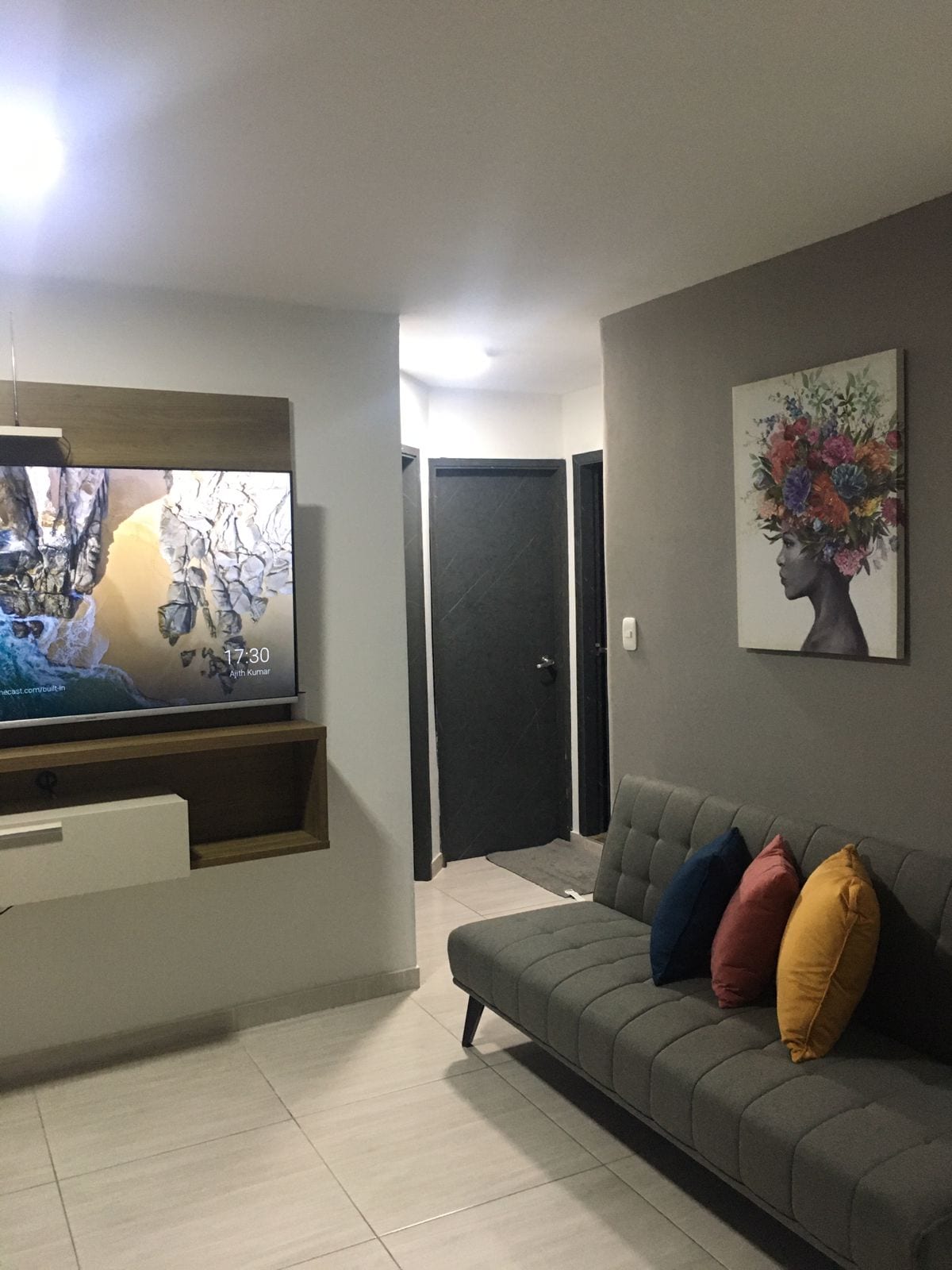 Bekväm och vacker lägenhet med 2 sovrum, vardera med omklädningsrum, privat badrum och luftkonditionering. Huvudrum med dubbelsäng (en annan dubbelsäng under) och det andra rummet med 2 enkelsängar (ytterligare 2 enkelsängar under). Fullt utrustat kök. Vardagsrum och arbetsrum med AA. Höghastighets wifi och kabelsignal. 3 Smart TV. Byggnad med pool och gym. Säkert område. Observera att du måste skicka in din dokumentation före incheckning (kolombianska lagar).