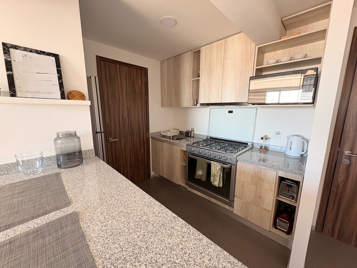 Om du behöver två sovrum, kolla in mitt andra boende. Vacker, välutrustad lägenhet belägen i Privalia Ambienta med 1 sovrum och 2 fulla badrum. Bara 6 minuter från Antea och Juriquilla, 10 minuter från Paseo Querétaro och 35 minuter från flygplatsen. Höghastighetsinternet med fiberoptik. Perfekt för arbete hemifrån och videokonferenser. Perfekt för långtidsvistelser. Lägenheten är utrustad med solpaneler för el. Hjälp planeten genom att bo här.