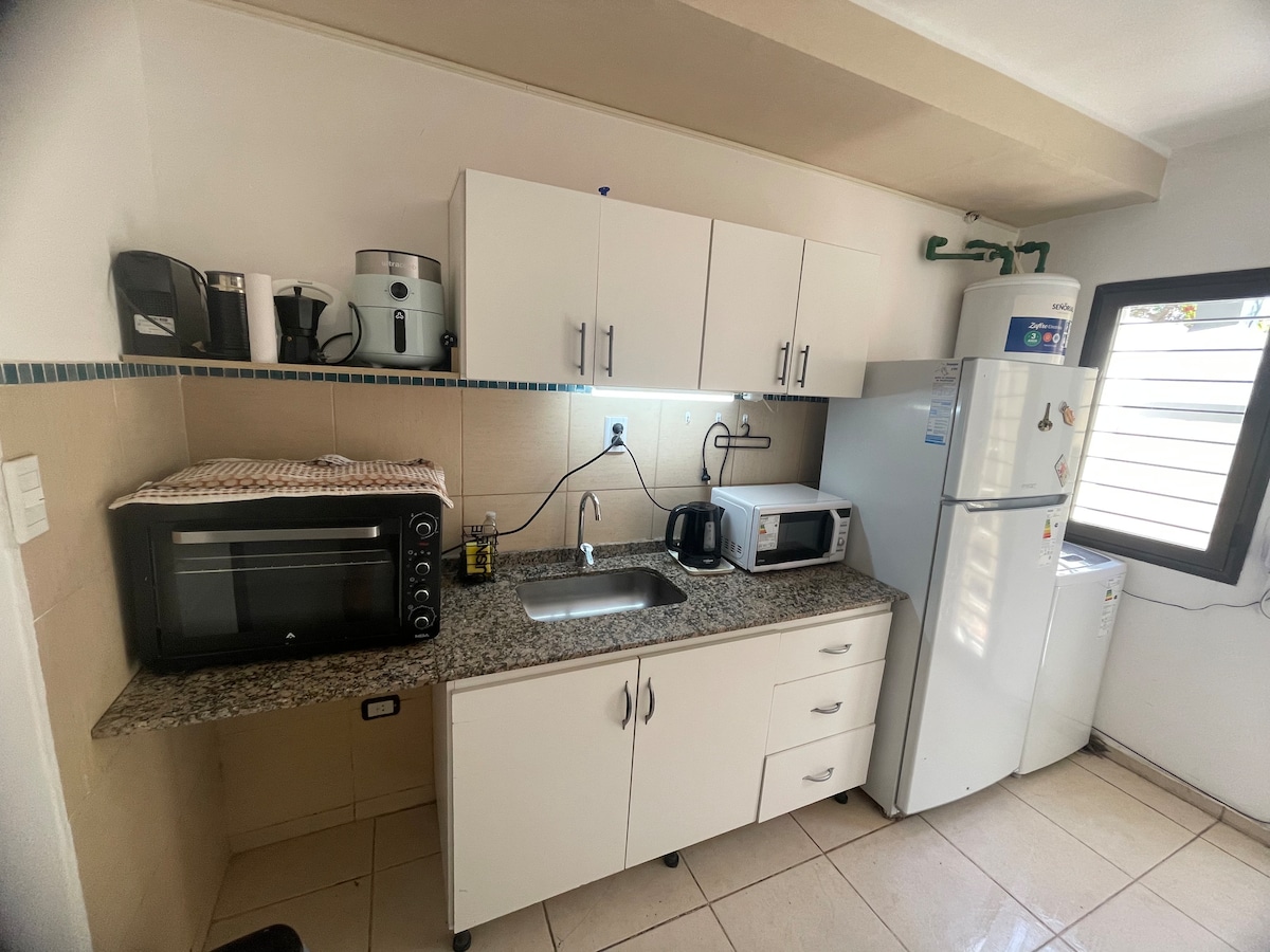 Bekvämt och mysigt hus med pool och grill i trädgården, perfekt för upp till fyra personer. Den har två sovrum och ett skrivbord. Beläget i ett lugnt bostadsområde, mittemot Plaza Gustavo Cerati, 7 km från centrum, 10 km från Ullum-dammen och 12 km från El Zonda Race Track. Utrustad med Netflix, WiFi, strålande plattvärme, luftkonditionering och ett garage för ett fordon.